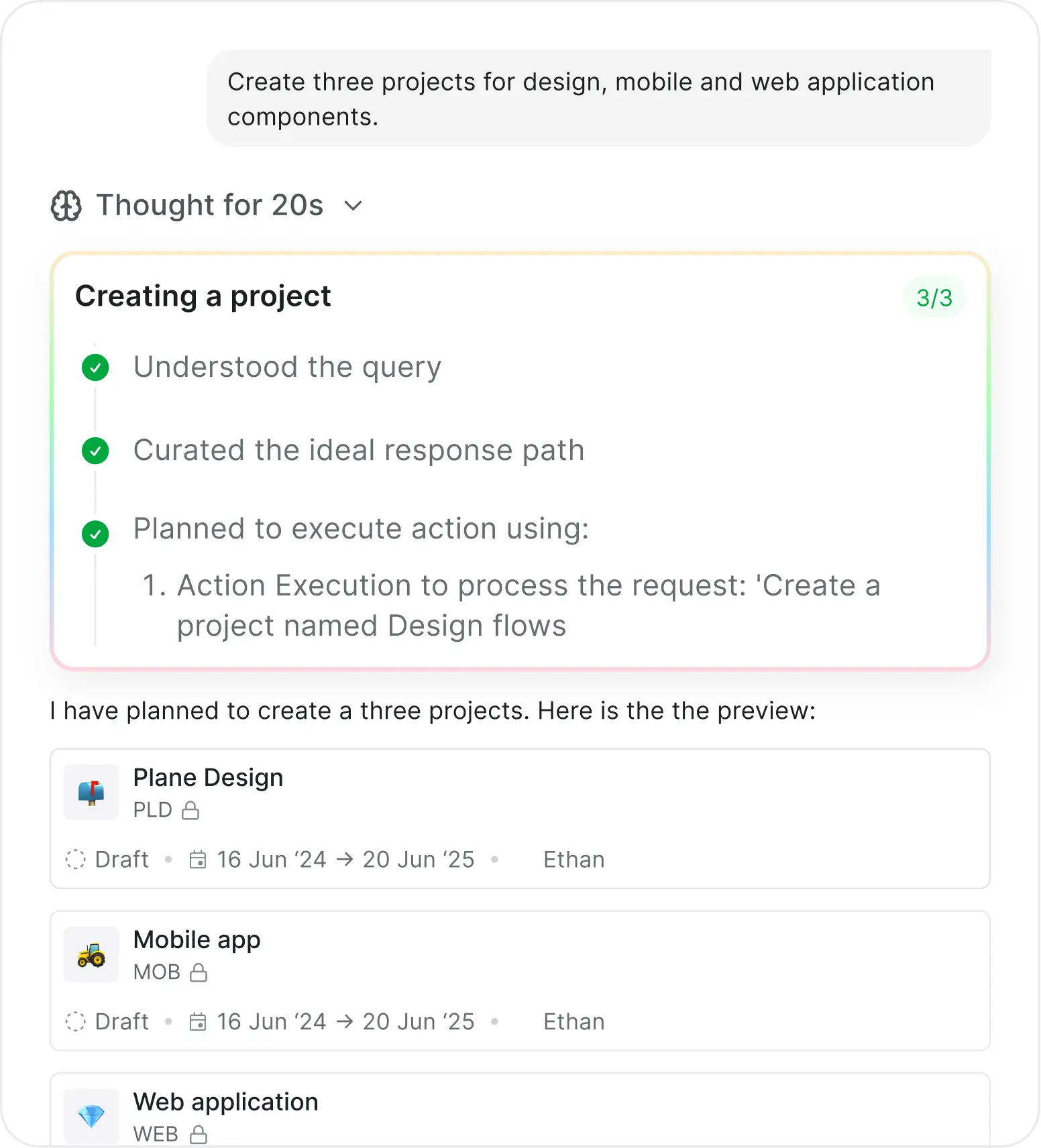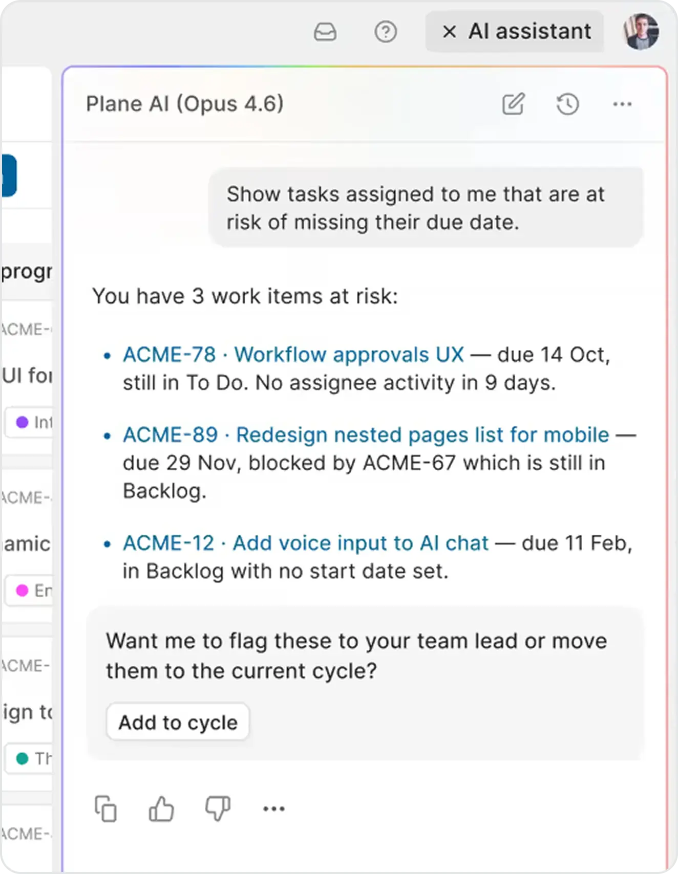 We focused instead on insight amplification. By steering users toward more actionable queries and linking results back to the core Plane UI, users still felt productive without the AI performing automated actions (which came later in the roadmap).